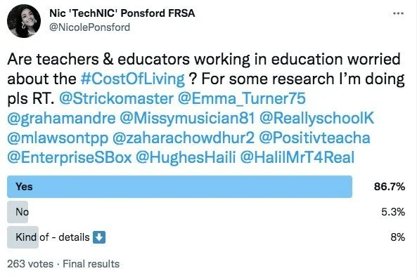 I ran a poll on Twitter to gauge opinion and 86.7% of those who voted said ‘Yes” teachers and education are worried about the #CostOfLiving. Comments often cited that teachers were more worried about their students and families than themselves but petrol prices were the main issue, with living costs for support staff a close second.