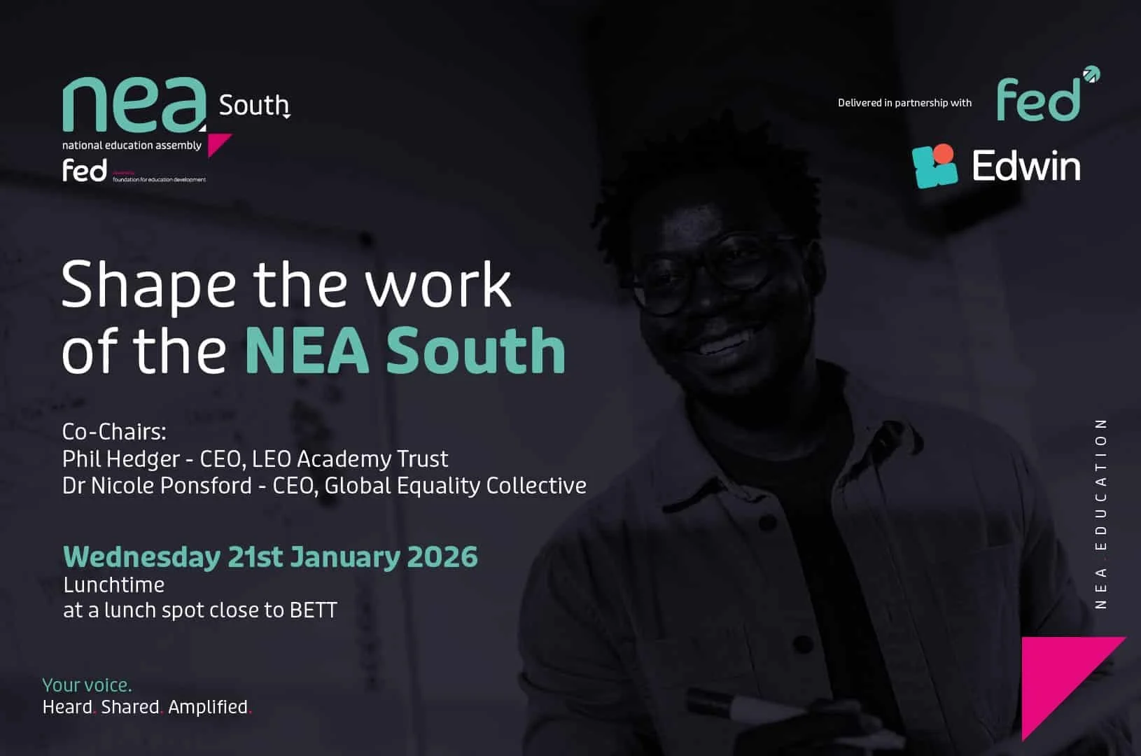 We are inviting education stakeholders from across the South to help shape the first National Education Assembly (NEA) South meeting, co- Chaired by Dr Nicole Ponsford CEO & founder of the GEC and Phil Hedger, CEO of LEO Academy Trust.